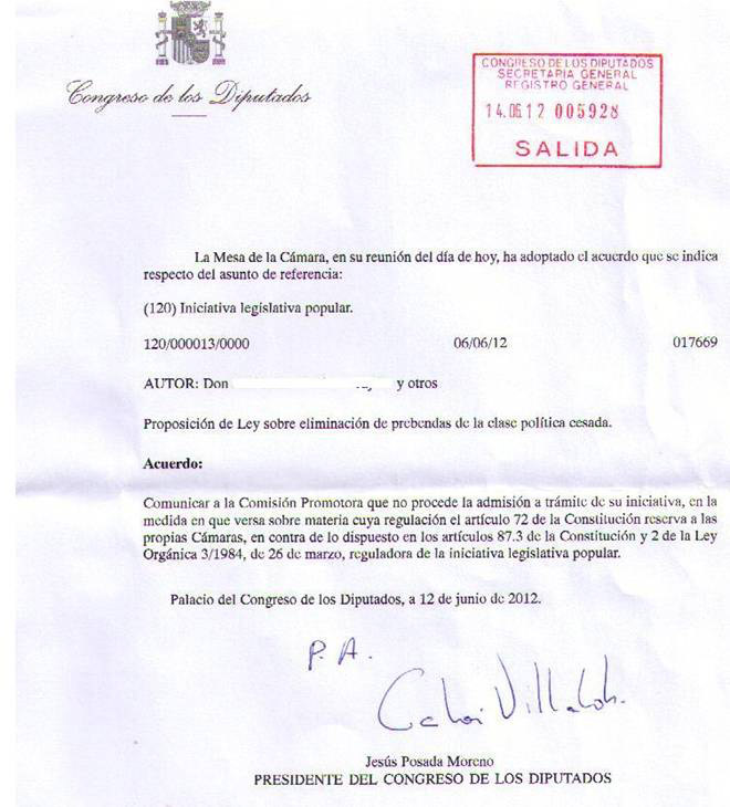 Esta es la respuesta que le ha dado el Congreso de los Diputados a una iniciativa popular que pedía que cuando los politicos acabaran su mandato no siguieran cobrando, del Estado, como hasta ahora.
